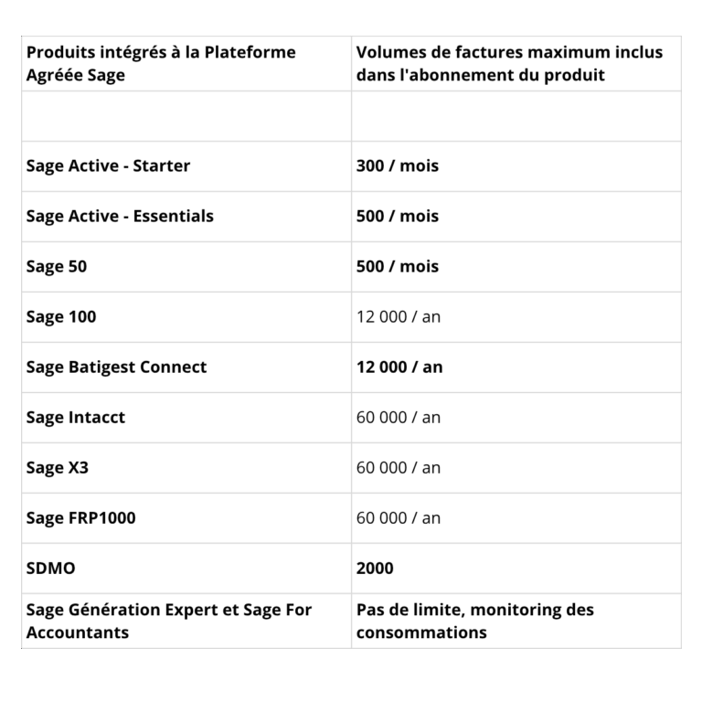 - Aucun surcoût : la Plateforme Agréée est incluse dans votre abonnement Sage, dans la limite du plafond annuel de factures